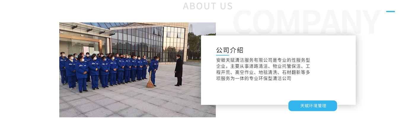安徽天賦清潔服務有限公司是的服務型企業(yè),主要從事道路清潔、物業(yè)托管保潔、工程開荒、高空作業(yè)、地毯清洗、石材翻新等多項服務為一體的環(huán)保型清潔公司。公司管理機制完善,清潔作業(yè)經驗豐富,擁有技術力量,嚴格實行崗前培訓—崗中督查—上崗在培訓的員工管理措施,憑著優(yōu)良的清潔質量和嚴格的督查管理,為眾多企事業(yè)單位、醫(yī)院、酒店、廠區(qū)商場、物業(yè)、道路、學校、公園等提供后勤清潔服務。在業(yè)內擁有良好的口碑。工作人員,服務態(tài)度優(yōu),竭力為客戶提供好的保潔服務。安徽天賦清潔服務有限公司:致力于長期合作關系,提高服務質量,提供高標準的清潔服務。公司的經營理念:為營造一個更清潔、亮麗的生活和工作環(huán)境而努力!“誠信”是公司成功保證。“客戶至上,信譽為首”是公司宗旨。高標準提供服務,維護客戶利益、形象,是我始終不渝的目標。